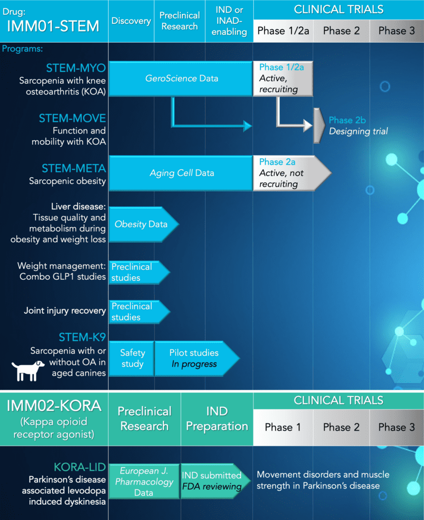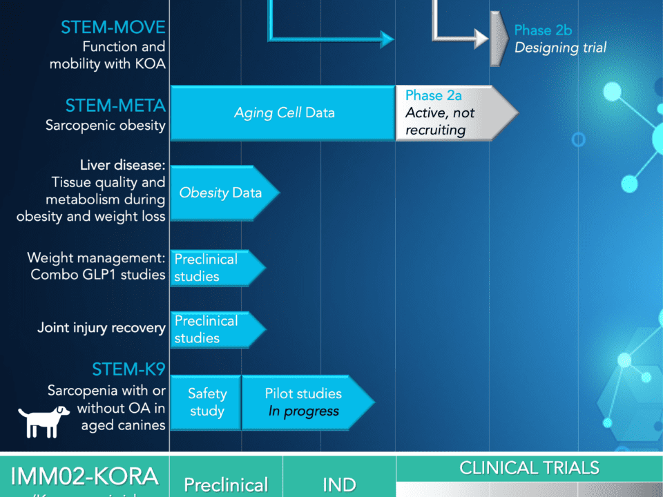 Immunis, Inc., a clinical-stage biotech developing novel, multi-active biologics for age and disease-related immune dysregulation, is proud to announce the successful completion of its Phase 1/2a clinical trial. The clinical study investigated the safety, tolerability, and preliminary efficacy of Immunis’ investigational therapy, IMM01-STEM, in reversing muscle atrophy in elderly individuals with knee osteoarthritis.