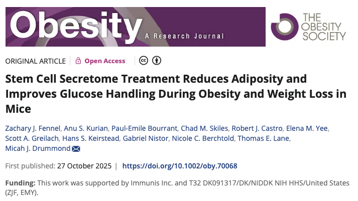 Immunis, Inc., a clinical-stage biotech developing innovative stem cell-derived biologics for age and disease-related immune dysregulation, announces the publication of its peer-reviewed research in collaboration with Dr. Micah Drummond from the University of Utah. The study published in Obesity is titled, “Stem Cell Secretome Treatment Reduces Adiposity and Improves Glucose Handling During Obesity and Weight Loss in Mice.”